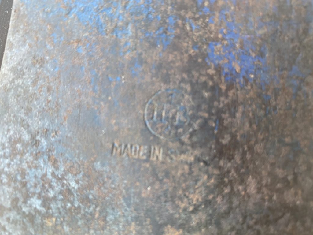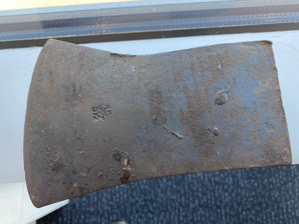 I expect the axe head is cold stamped marks, also being pre 1988. How old is it? what do the stampings mean 1.5_3 1/2 What is axe used for e.g. tree felling? what length of the handle would it have been fitted with when new? what type of steel would the axe head been made of? What is the blue colour mean? how will I restore it? is it worth any money?